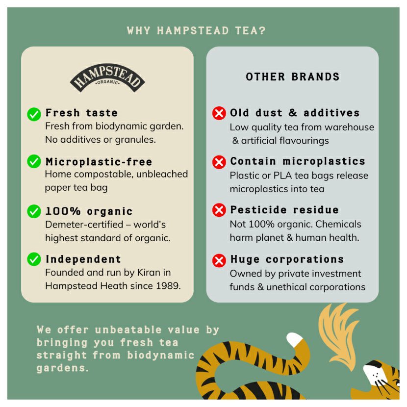 Společnost Hampstead Tea London vznikla v roce 1989. První čaje s certifikací biodynamického zemědělství a Fairtrade začala vyrábět v roce 1995. Společnost Hampstead Tea London vrací část svých zisků zpět do farmářských komunit, se kterými velmi úzce osobně spolupracuje. Peníze jsou investovány na podporu rozvoje především v oblasti školení zemědělců, vzdělávání a lékařské péče. Lidem, kteří čajové lístky sbírají a zpracovávají, se tak dostává za jejich práci spravedlivé odměny a mohou žít v důstojných podmínkách v místě svého domova.